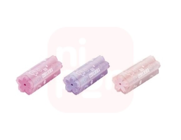 Inspiradas nas flores de cerejeira, a borracha possui textura macia e com flor em todo o interior da borracha. É não tóxica e tem rótulo plástico protetor. Dimensões: 2,2x5x2,2cm.