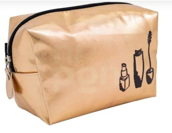 A nécessaire possui espaço suficiente para acomodar diversos itens essenciais de maquiagem, mantendo-os organizados e acessíveis quando necessário. Sua estampa dourada com os desenhos de um pincel de máscara de cílios e um batom a torna um item de moda que pode ser exibido orgulhosamente em sua bolsa ou mesa de maquiagem.